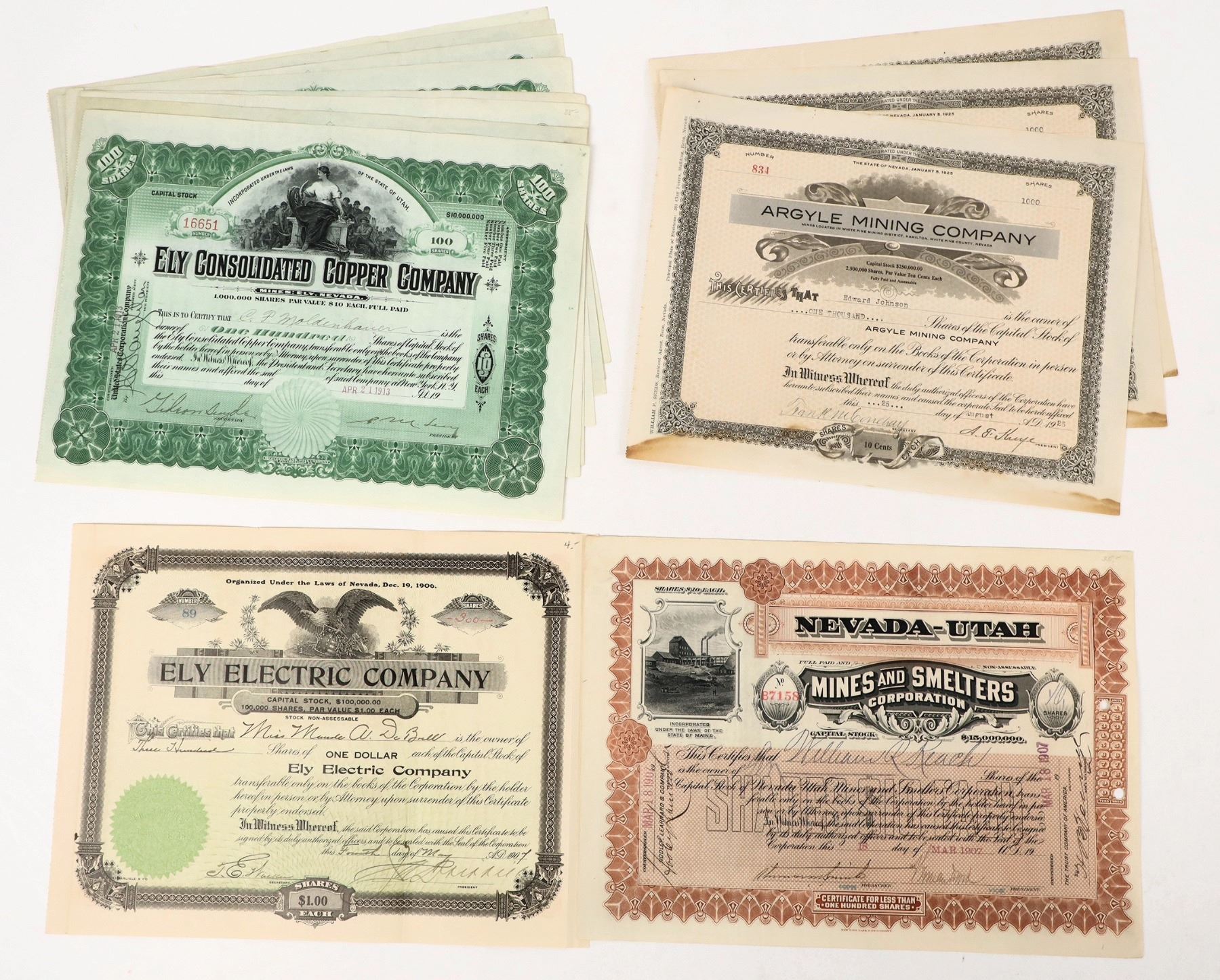 Ely & White Pine Mining Stocks c.1907-25 includes Ely Consolidated Copper Company (8) Ely Electric Company (1) Nevada-Utah Mines and Smelters Corporation (1) Argyle Mines Company (3)