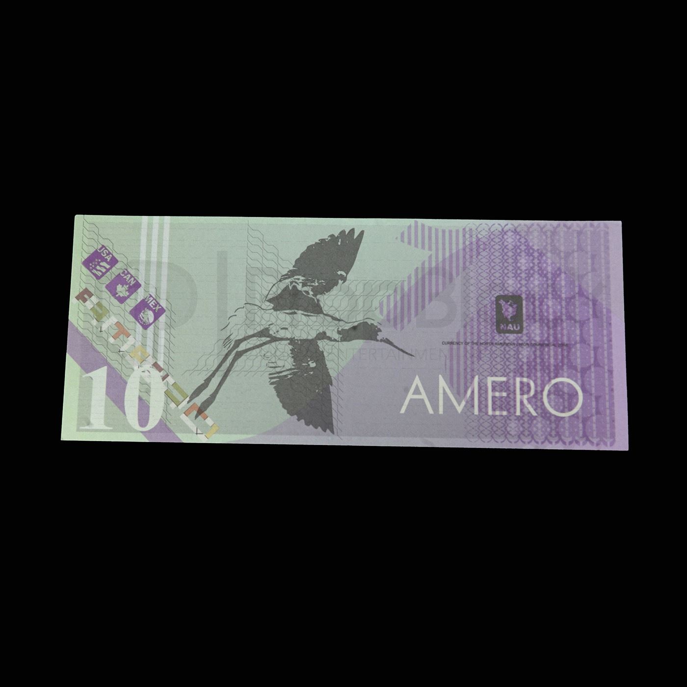 Set of three currency, or "Amero" bills used in the production of the 2013 Neil Blompkamp film Elysium. In the year 2154, humanity is sharply divided between two classes of people: The ultrarich live aboard a luxurious space station called Elysium, and the rest live a hardscrabble existence in Earth's ruins. His life hanging in the balance, a man named Max (Matt Damon) agrees to undertake a dangerous mission that could bring equality to the population, but Secretary Delacourt (Jodie Foster) vows to preserve the pampered lifestyle of Elysium's citizens, no matter what the cost. This set features three faux futuristic currency notes, all green, purple and white in color. Each piece is printed on white paper and remains in excellent, production used condition.