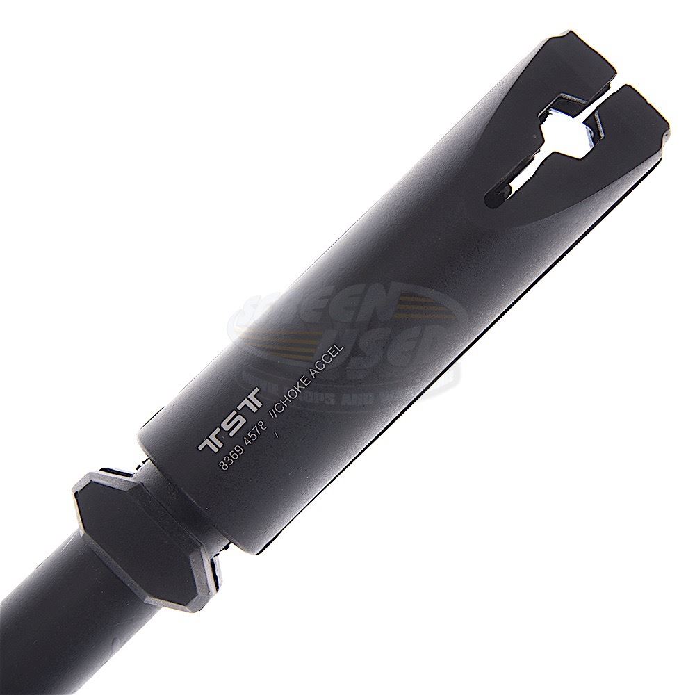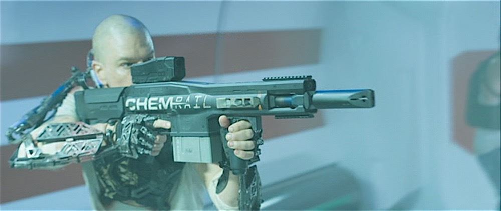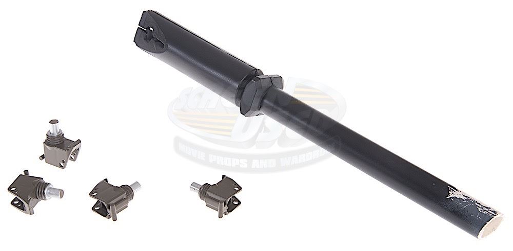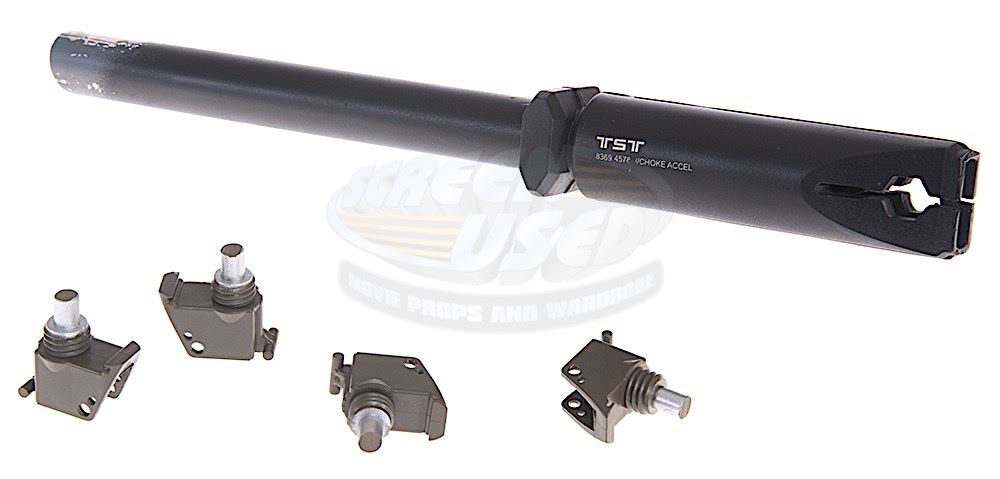 (TriStar Pictures, 2013) This prop ChemRail gun barrel was custom-made by Weta for use by various actors and as set dressing. The barrel is constructed of a plastic pipe, with custom molded barrel tip attached with applied graphics to one side. The barrel measures 15" in length. Included with the barrel are four prop triggers that were also made by Weta for use on various props. The triggers are made of plastic with no moving parts. Each measures 1.5" x 1.5" x .75".