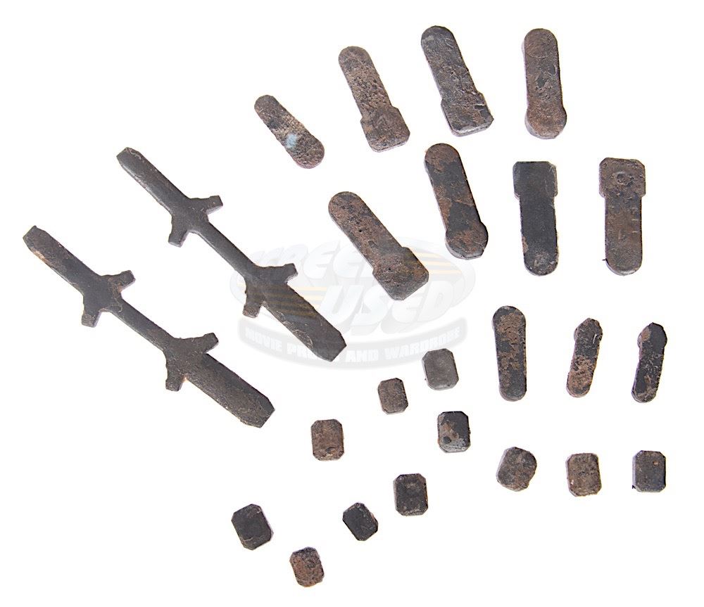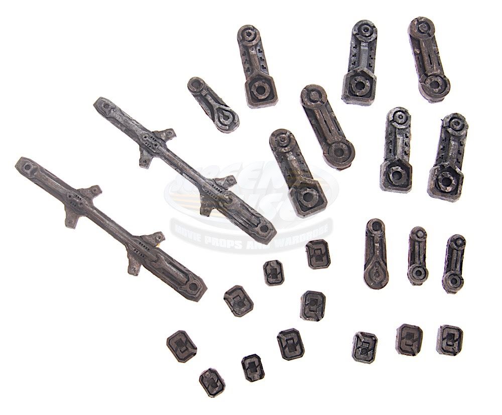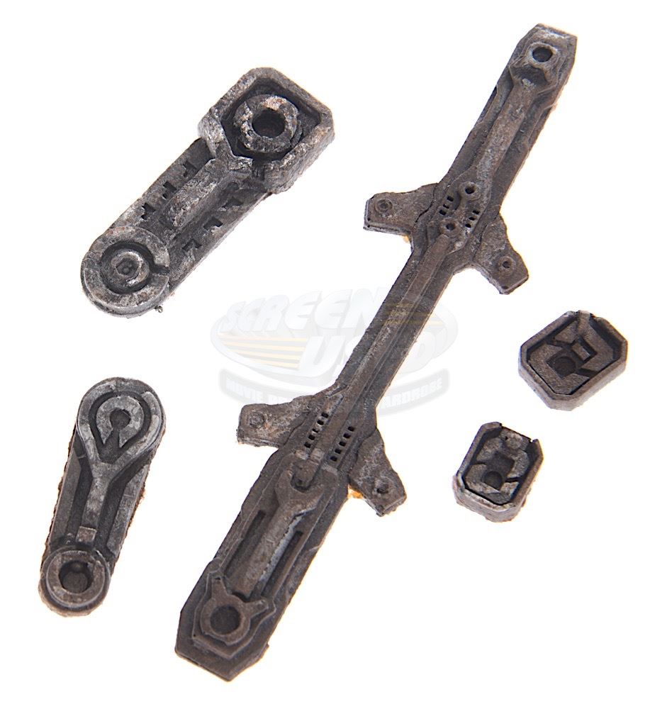 (TriStar Pictures, 2013) This collection of 23 make-up appliances were custom-made by the production for use by Sharito Copley as "Kruger". The appliances are made of rubber and are detailed to look like metal components. The appliances were applied to Sharito Copley's face, neck and arms during filming to simulate metal implants. The pieces range in size from .5" x .5" to 4.5" x 1".
