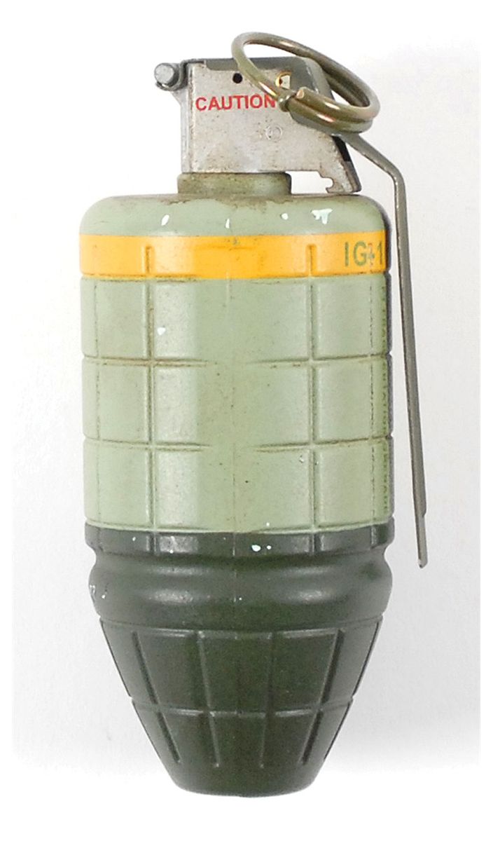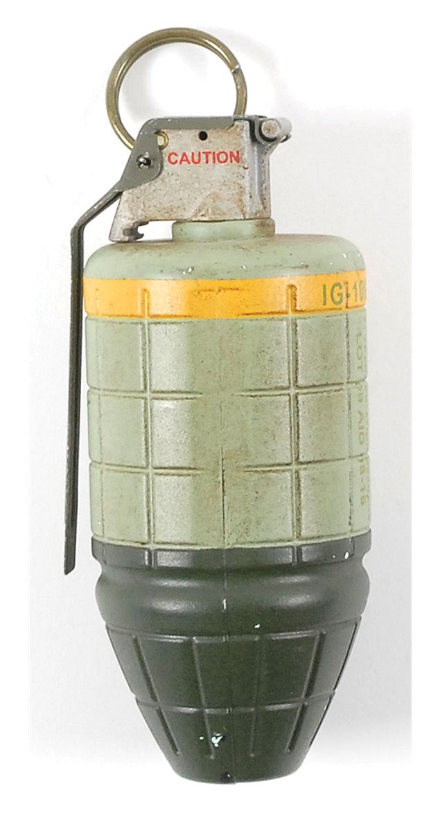 Screen-used grenade used by Matt Damon in the role of Max Da Costa in the 2013 film Elysium. Grenade is made from hard resin by Weta of New Zealand, measures 6? long, and has removable pin and handle that flies off when pin is pulled. Accompanied by a 2014 letter of authenticity which reads, in part: “This version of the grenade was used for closeups and has the working metal pin…This is probably the best condition of all the grenades sold by MRC at their auction last year. Originally produced by Weta of New Zealand.” In fine condition, with expected light wear and soiling.