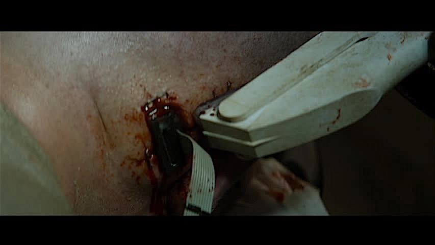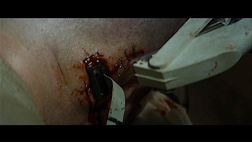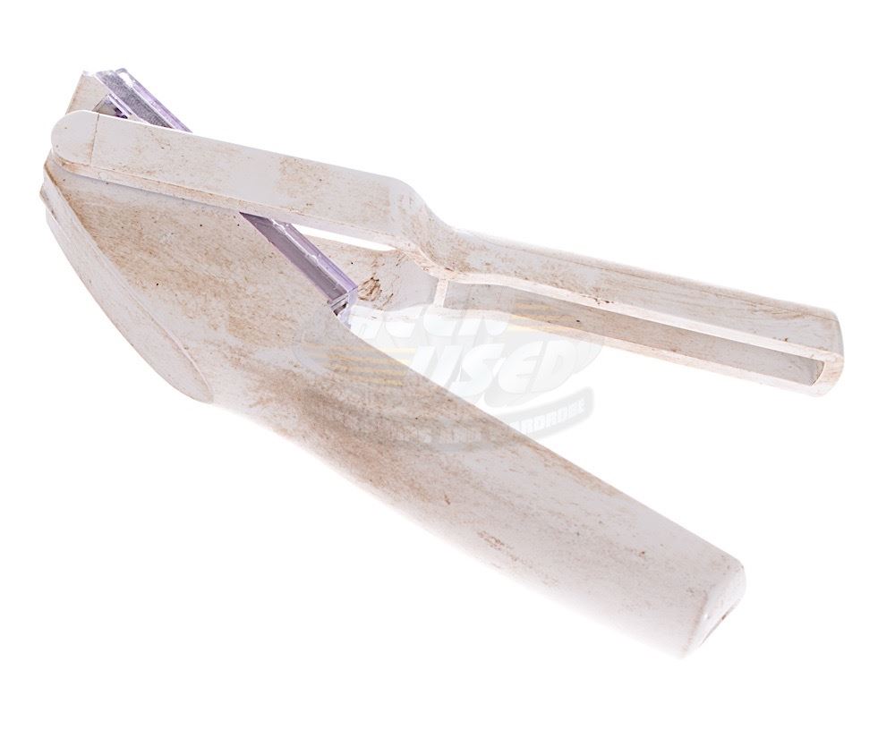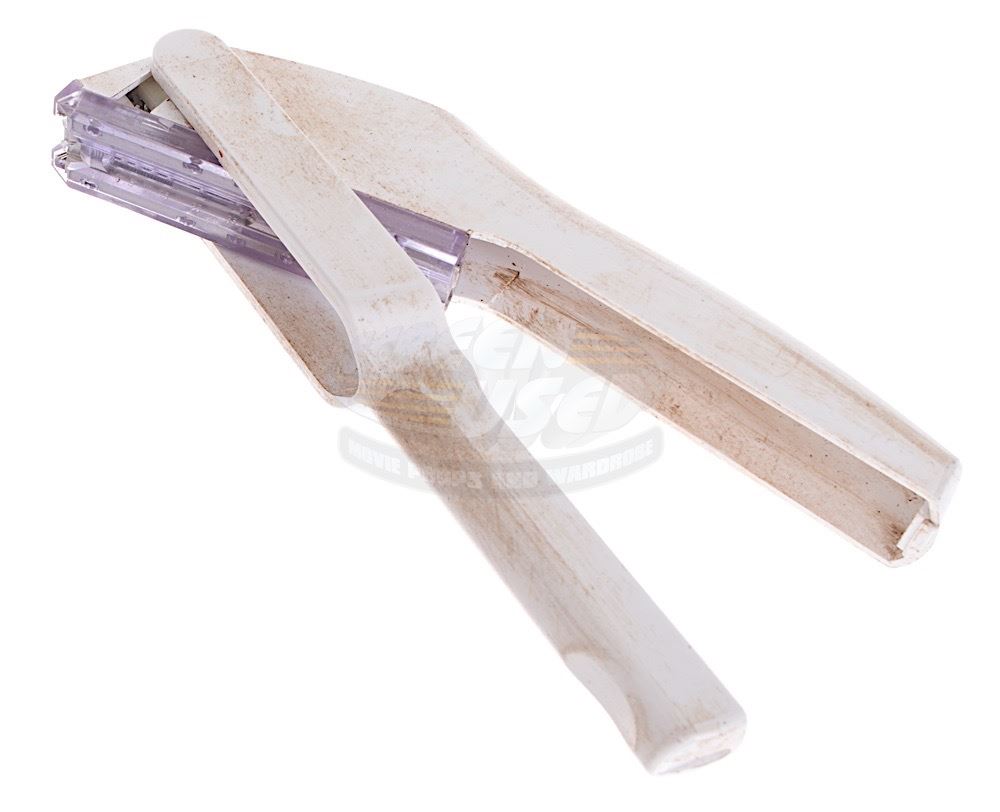 (TriStar Pictures, 2013) This prop head stapler was acquired by the production for use by various actors during the operation scene on Max DaCosta. The stapler is made of plastic and metal, with studio distressing for filming. Measures 6.75" in length, wear from use is present.