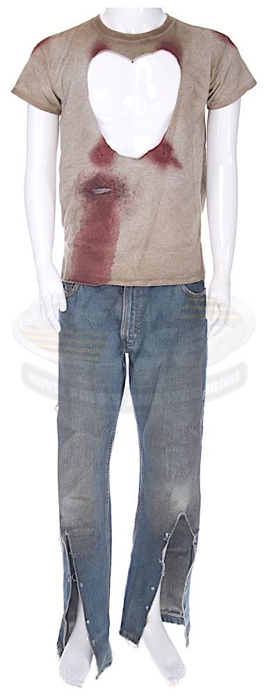 (TriStar Pictures, 2013) This outfit was acquired by the production for use by Matt Damon as "Max". The outfit consists of a t-shirt and a pair of jeans. Both the shirt and jeans are distressed for filming and feature torn sections, studio blood applied and holes in various locations for mounting the exoskeleton components. Included with the outfit is a production used costume tag that details the entire costume, change and scene numbers used.