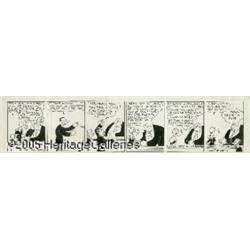 <B>Elzie Segar - Popeye Daily Comic Strip Original Art, dated 5-31-37 (King Features Syndicate, 1937).</B></I> In this side-splitting daily, Popeye is fined by a judge for "sockin' the persecutin' attorney." The irascible sea-dog soon sweet-talks the judge into reducing his fine from one million dollars all the way down to a dime -- what a litigator! E.C. Segar's genius at comic timing is showcased in this six panel comedy masterpiece. The image area is 20.5" x 4.5". Panel one has a two inch tear that runs through Popeye's word balloon; it has since been closed with tape on the back of the art; zip-a-tone shading film has slipped off the art, leaving behind mild glue stains; and the strip was folded vertically four times; otherwise the art is in Good condition. Arf! Arf! Practice wise judgement, and put in your bid on this delightful daily! <I>From the collection of Gill Fox.</B></I>