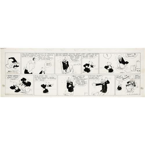 <B>Elzie Segar - Sappo Sunday Comic Strip Topper Original Art, dated 3-9-30 (King Features Syndicate, 1930).</B></I> Few artists could match E. C. Segar at creating irrepressible and outrageous personalities -- just ask Sappo! The eccentric, potential boarder in this gag is a splendid example of just such a character. The image area of the Sunday is 20" x 6.5". Aside from light wear and surface soiling, the art is in Very Good condition.<BR><BR><b>Shipping:</b> Large Flat (<a target="_blank" href="http://www.heritageauctions.com/common/shipping.php">view shipping information</a>)
