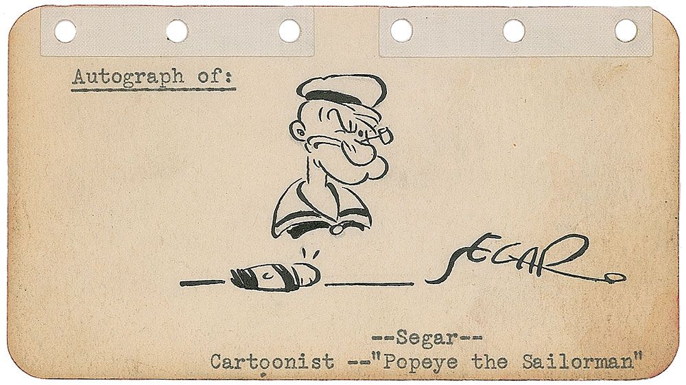 Original vintage signed ink sketch of Popeye on an off-white 4.5 x 2.5 page, signed “Segar,” with a small sketch of a lit cigar added next to his signature. In fine condition.