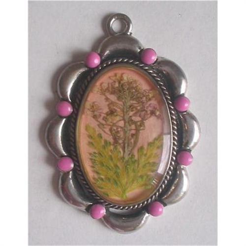 This is a very sweet and pretty oval shaped pendant with a dried flower arrangement at the centre embedded in lucite. The flowers are purple, lavender lilac colour with green stems and leaves. The background is a pale peach pink colour. A twisted, braided rope design details the oval setting. I just love the outer setting of this pendant. Scalloped curves of silver tone detailed with hot pink beads at each of the eight surrounding stations. Measures 1-1/2" inches wide by 1-3/4" inches tall. Excellent condition, no scratches or scuffs, will require a chain.