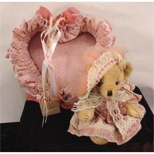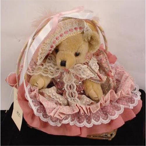 Embellished bear in lined wicker heart shaped basket 12" x 13"the bear is 12" tall with earings, necklace and feather hat with a ruffled lace dress and is in very good condition.[81]