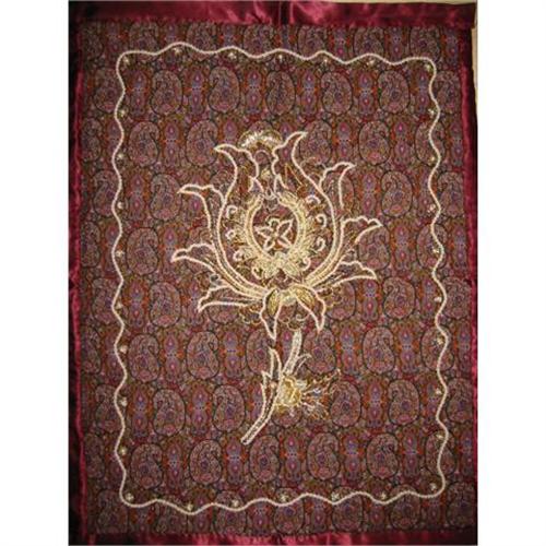 ELEGANTLY HAND CRAFTED GOLD TRIM TAPESTRY WITH PEARLS AND SATIN BACKING. IT IS HAND MADE AND CAN BE USED AS A SMALL TABLE COVER OR AS A RUNNER . IT CAN ALSO BE FRAMED AND DELICATELY MATTED FOR WALL DECORATION. IT IS APPROXIMATELY 25 INCHES TALL AND 19 INCHES WIDE. IT'S BEAUTIFUL.