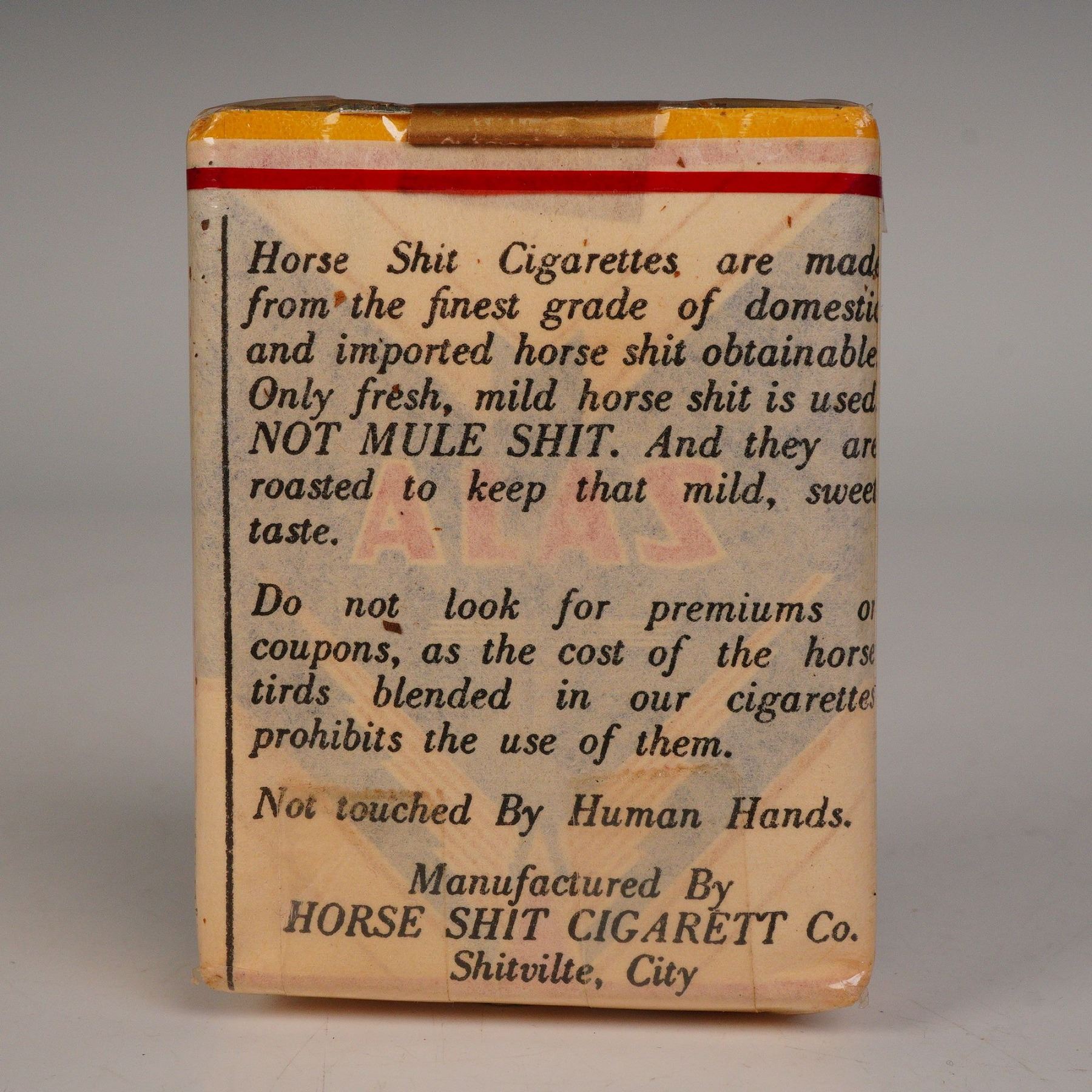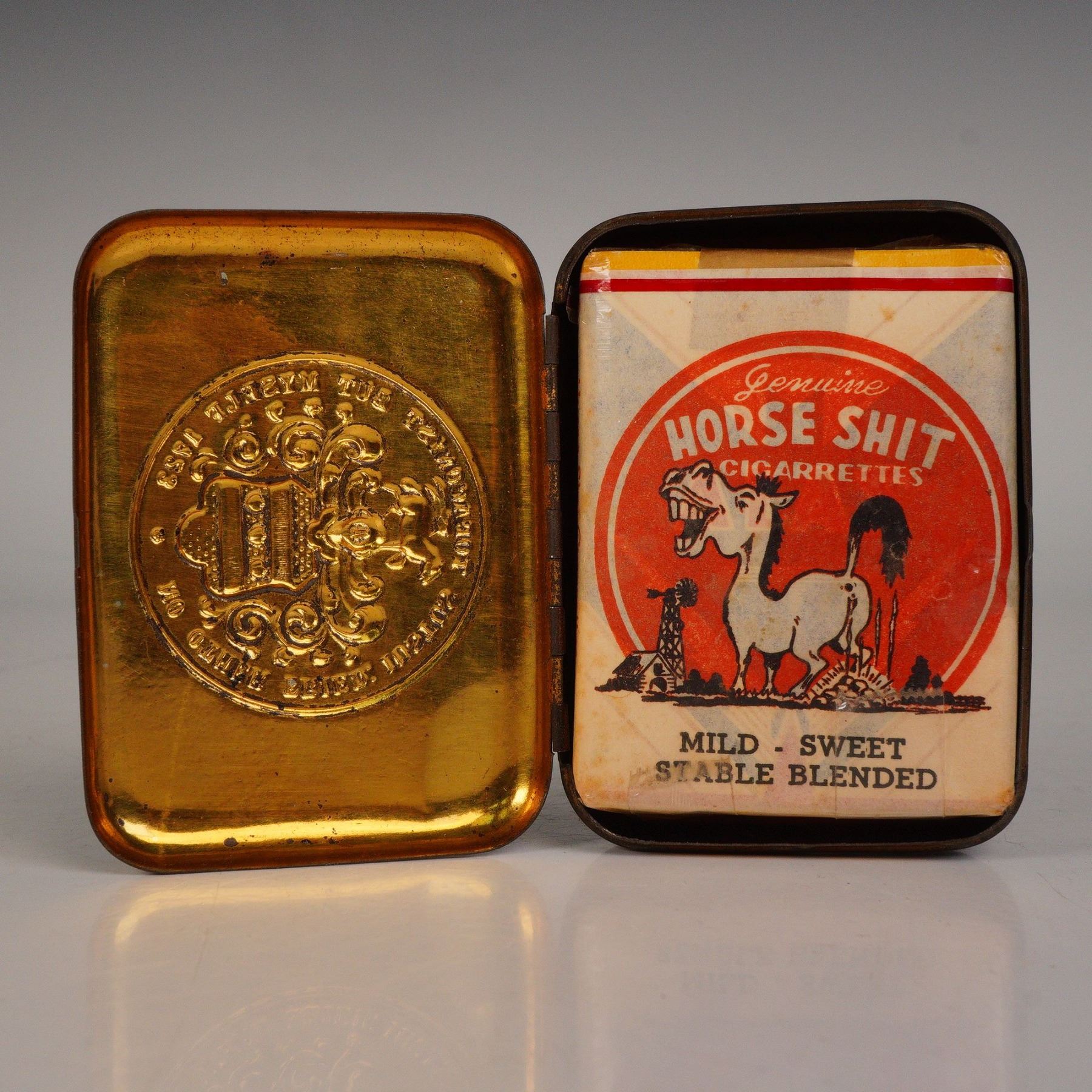 Novelty cigarette pack presented in a gilt brass hinged case embossed with a decorative coat of arms and Latin motto. Inside is a comedic "Genuine Horse Shit Cigarettes" pack labeled "Mild - Sweet - Stable Blended," attributed to the fictitious Horse Shit Cigarette Co., Shitville City. The reverse label includes humorous copy describing the "blend" and tongue-in-cheek production notes. A collectible conversation piece that highlights mid-century humor and playful advertising design.