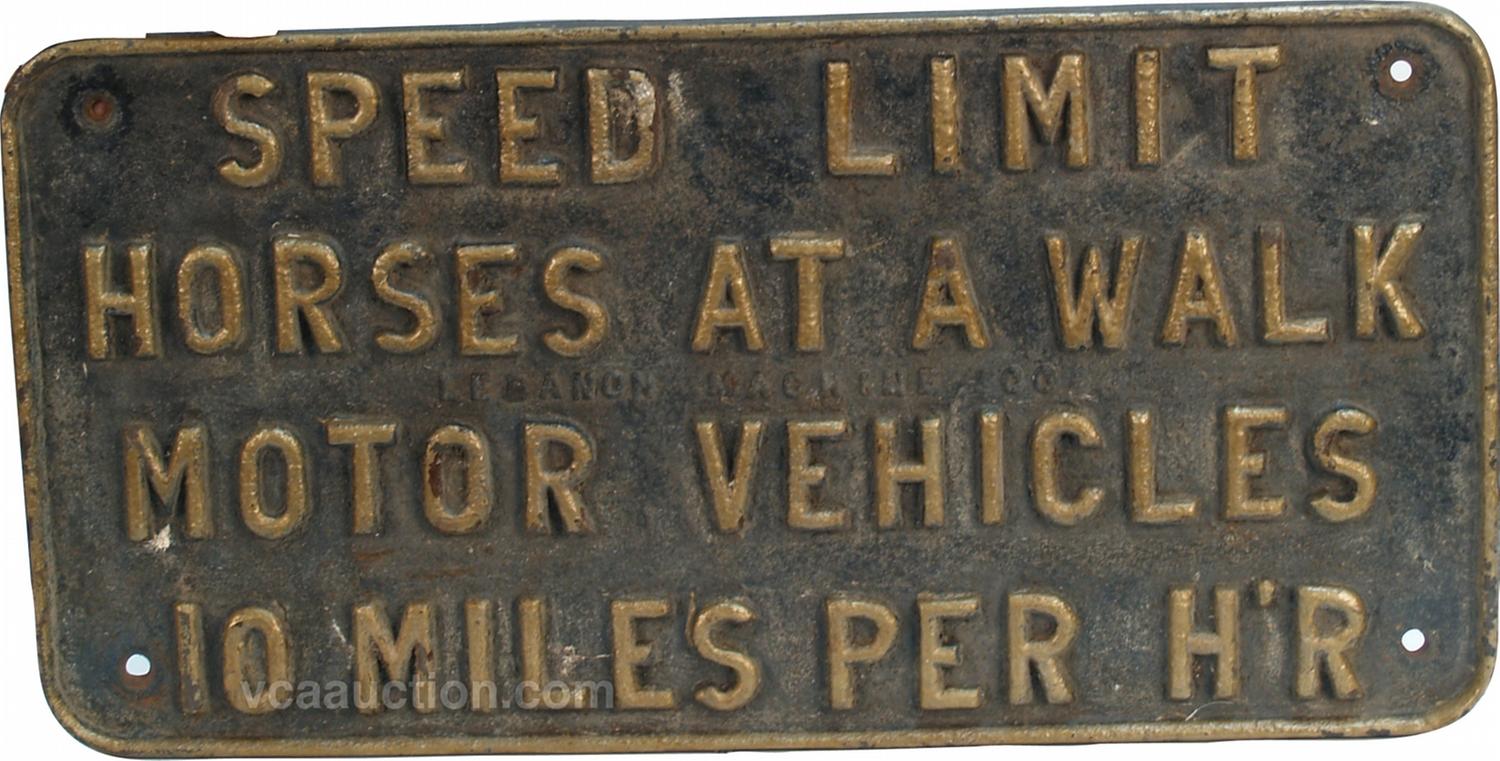 Embossed Cast-Iron Speed Limit Sign "Horses At Walk - Motor Vehicles - 10 Miles Per H'R" by Lebanon Machine Co. - 31" x 15"