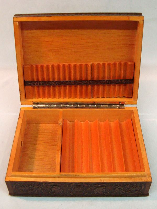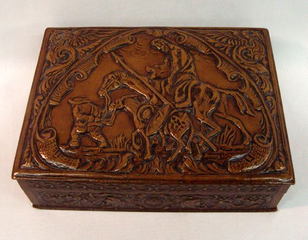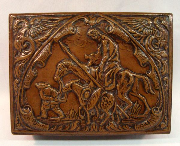 Embossed Leather Covered Cigar Box. Measures approx. 2''H x 8''L x 6''W. Don Quixote on the top.