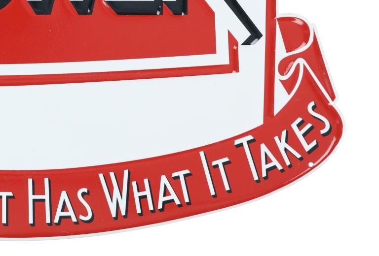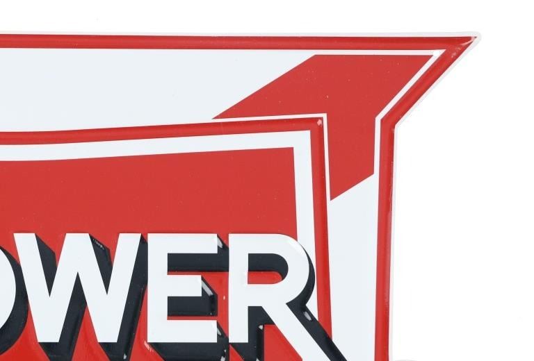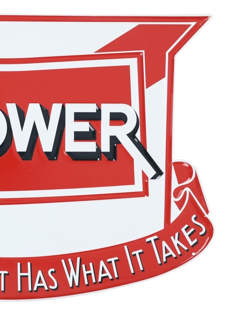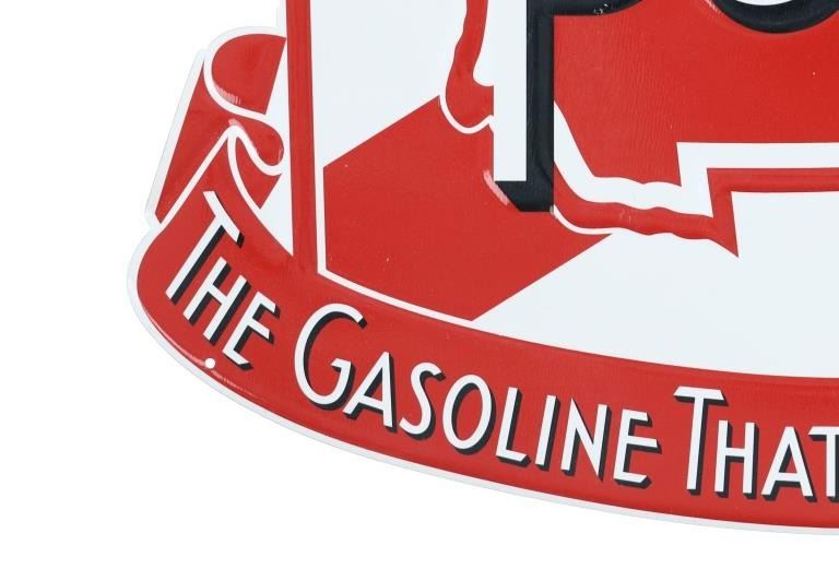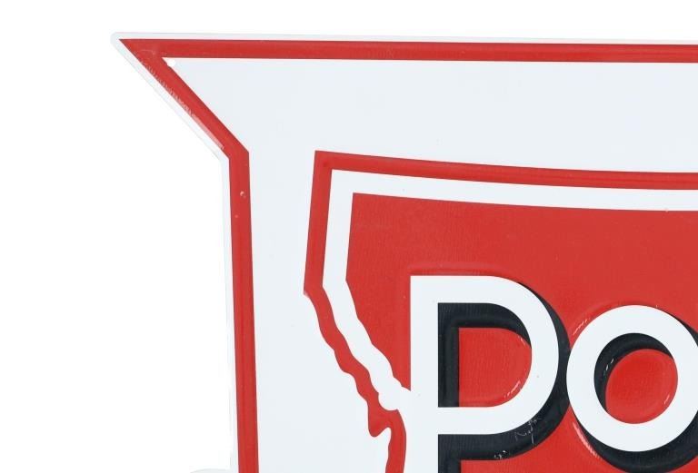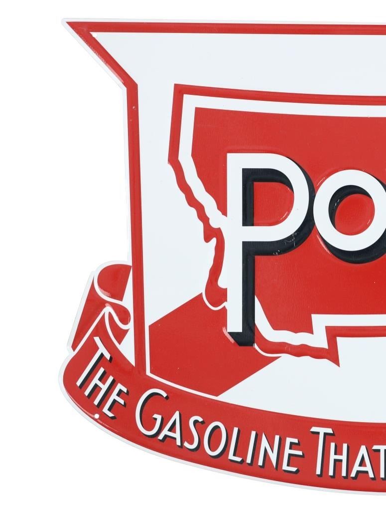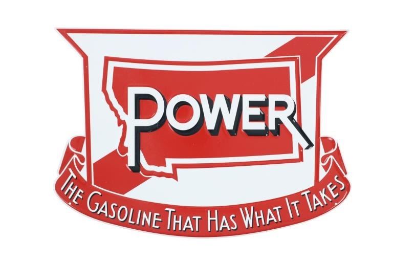 Featured in this lot is this embossed tin contemporary Montana Power Gasoline sign. Montana Power Co. inadvertently entered the gas & oil business when it started to produce a significant quantity of oil in its search for natural gas near Cut Bank, Montana. It partnered with Texaco and a group of independents to build the Glacier Refinery in Cut Bank in 1939. Montana Power Co. was then forced to exit the oil business by federal law and sold its interest to Union Oil of California in 1944. The sign shows the word, "Power" in white lettering, surrounded by the state of Montana outline in red with a banner below that reads, “The Gasoline That Has What It Takes” in white lettering. The sign shows good condition with little to no wear present. This is a modern contemporary sign, the measurements are 14"W x 20" L.
