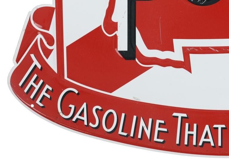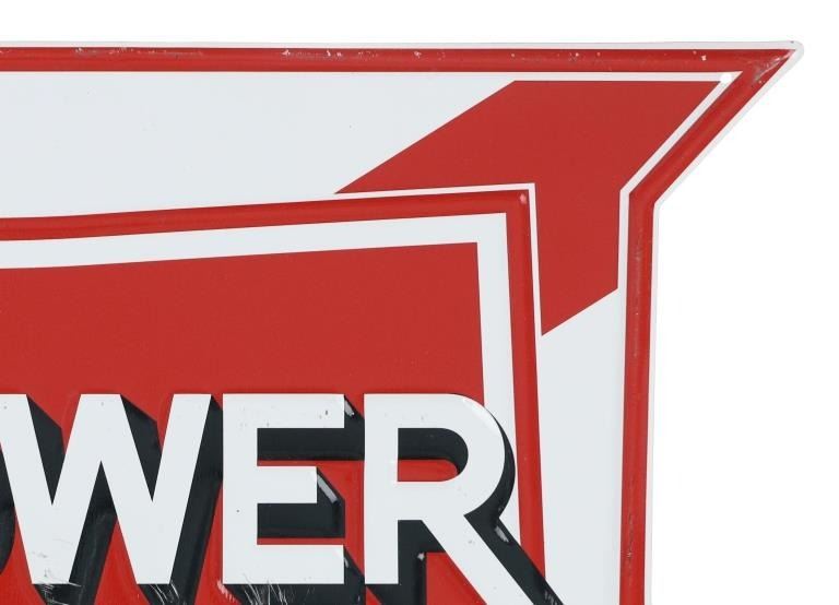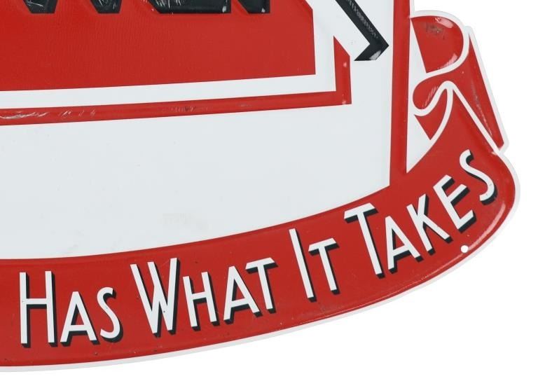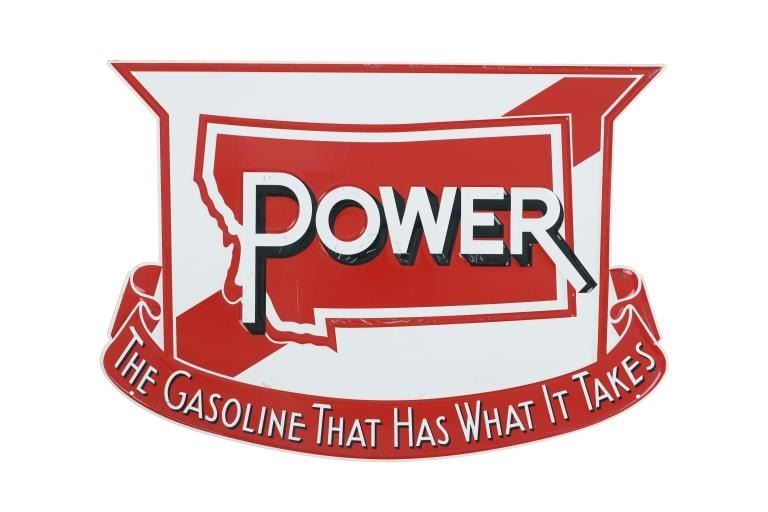 Featured in this lot is this embossed tin contemporary Montana Power Gasoline sign. Montana Power Co. inadvertently entered the gas & oil business when it started to produce a significant quantity of oil in its search for natural gas near Cut Bank, Montana. It partnered with Texaco and a group of independents to build the Glacier Refinery in Cut Bank in 1939. Montana Power Co. was then forced to exit the oil business by federal law and sold its interest to Union Oil of California in 1944. The sign shows the word, "Power" in white lettering, surrounded by the state of Montana outline in red with a banner below that reads, “The Gasoline That Has What It Takes” in white lettering. The sign shows good condition with little to no wear present. This is a modern contemporary sign, the measurements are 14"W x 20" L. Weight is 1 pound and 8 ounces.