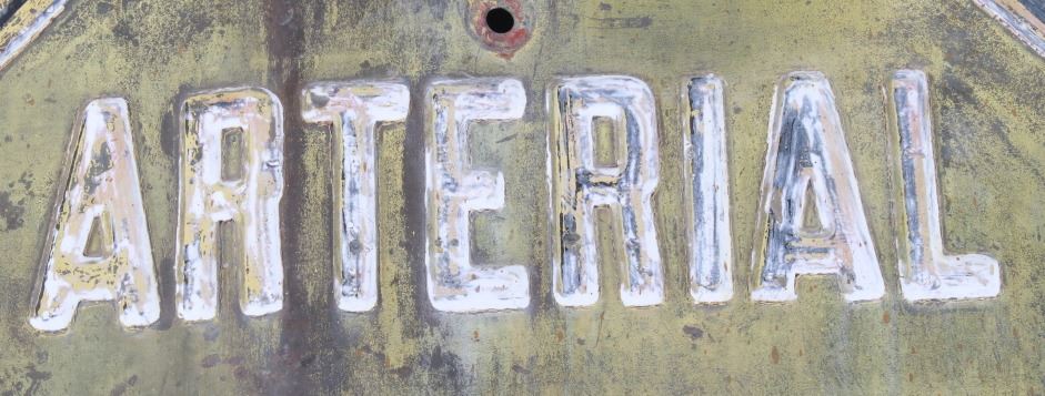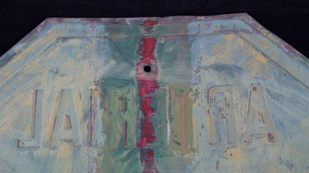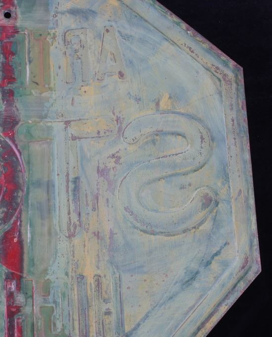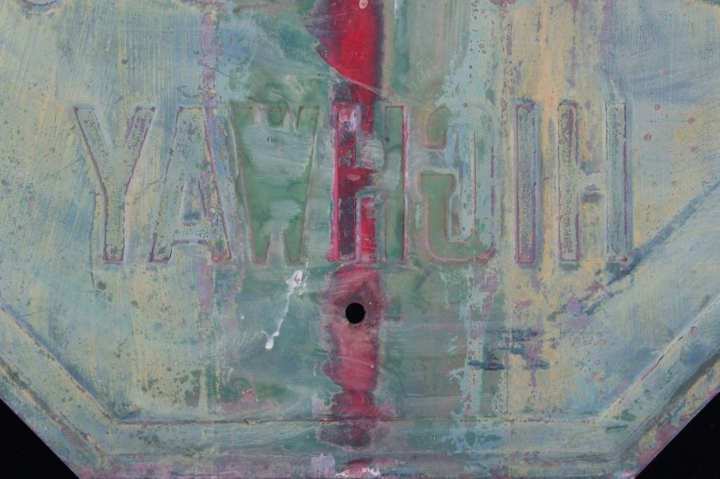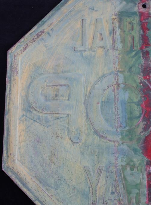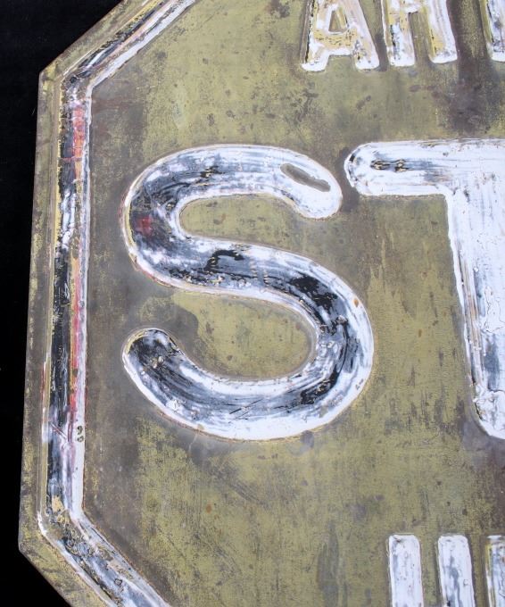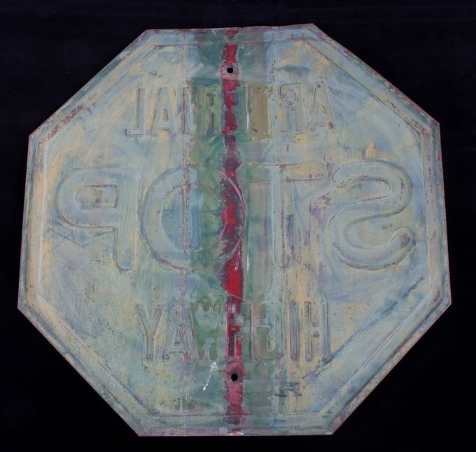 Included in this lot is an embossed, multi-colored, steel 'Arterial Highway Stop' sign. This sign has been repainted a few times, showing a dark yellow as the main color with white lettering. There are some remnants of black and red paint throughout the sign, as well. There is a hole at the top and bottom of the sign where it can be screwed in to hang on a pole. The sign is in good condition, not showing scratches or rust. The sign measures 24 1/4" by 24 1/4".