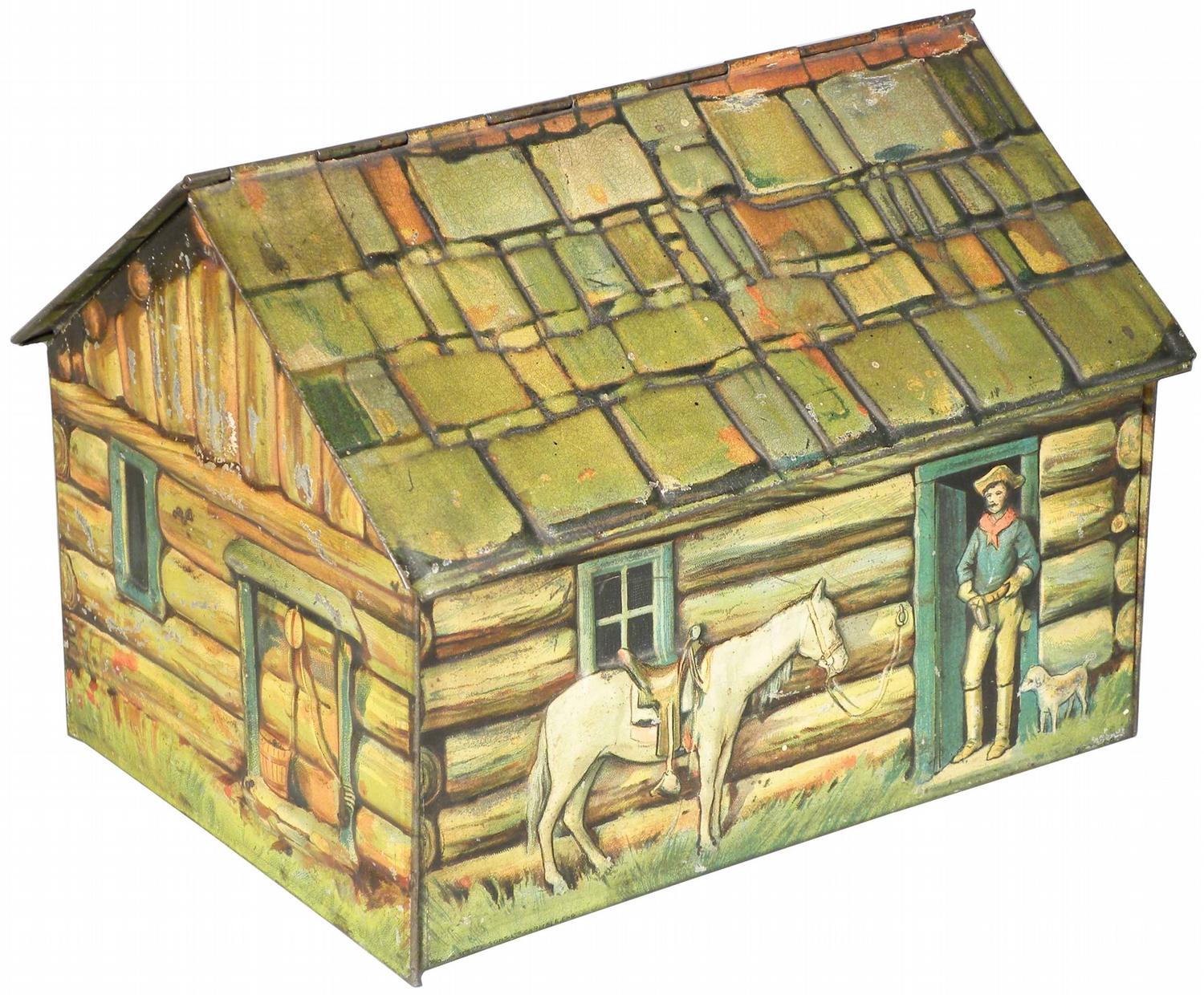 Embossed Tin Litho Biscuit Box. In the shape of a log cabin. Pioneer folks on one side, cowboy and horse on side. Some light rubs otherwise excellent condition. 6 1/2 X 5 X 4 1/2 inches. Starting bid $100