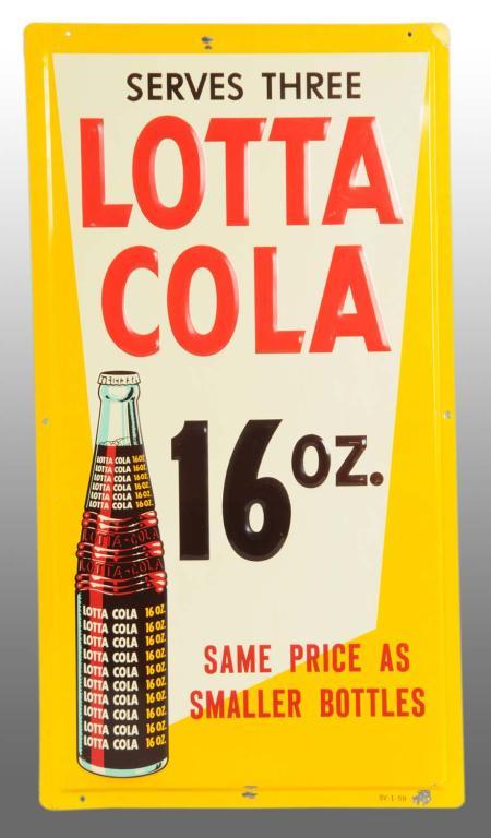 1959. Advertising sign for Lotta Cola with chips around mounting holes and chip at "6" o'clock. Condition (8.0 - 8.5, Excellent). Size 21 - 1/2" x 11 - 3/4".