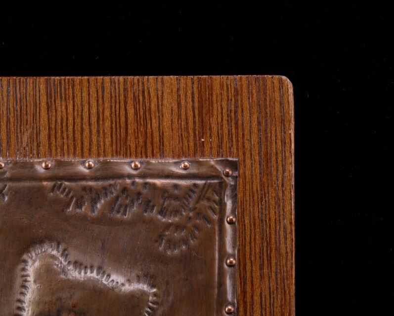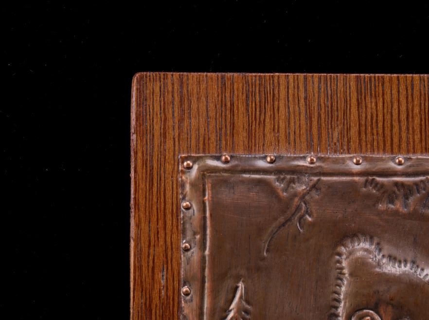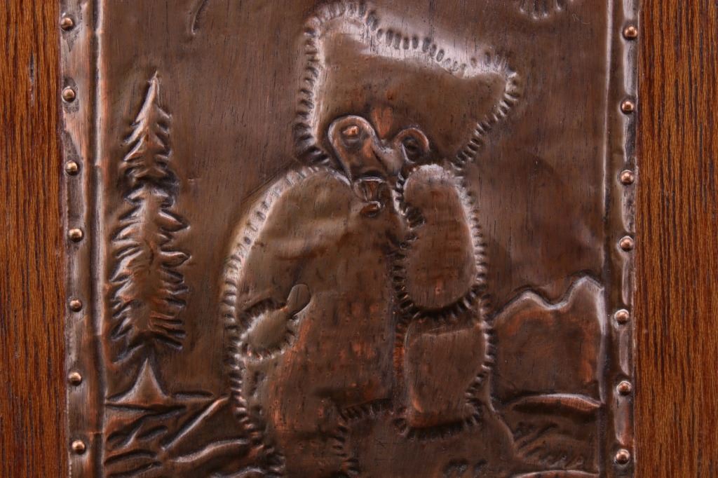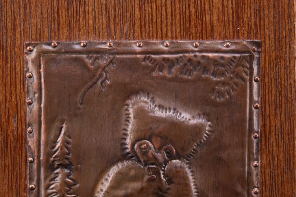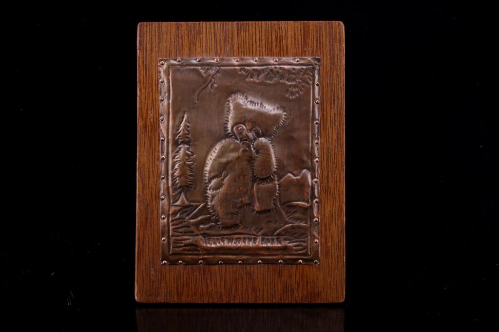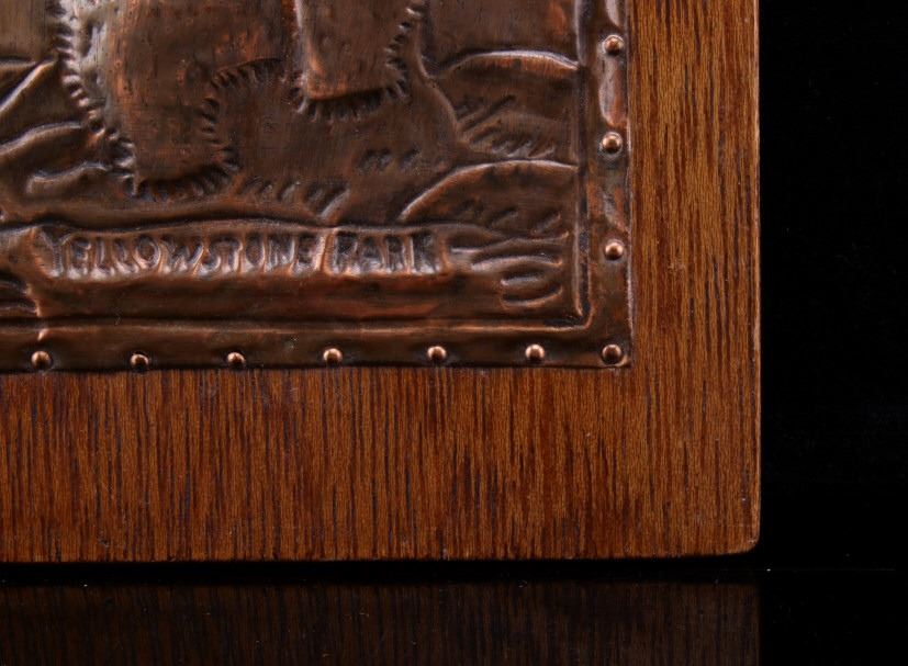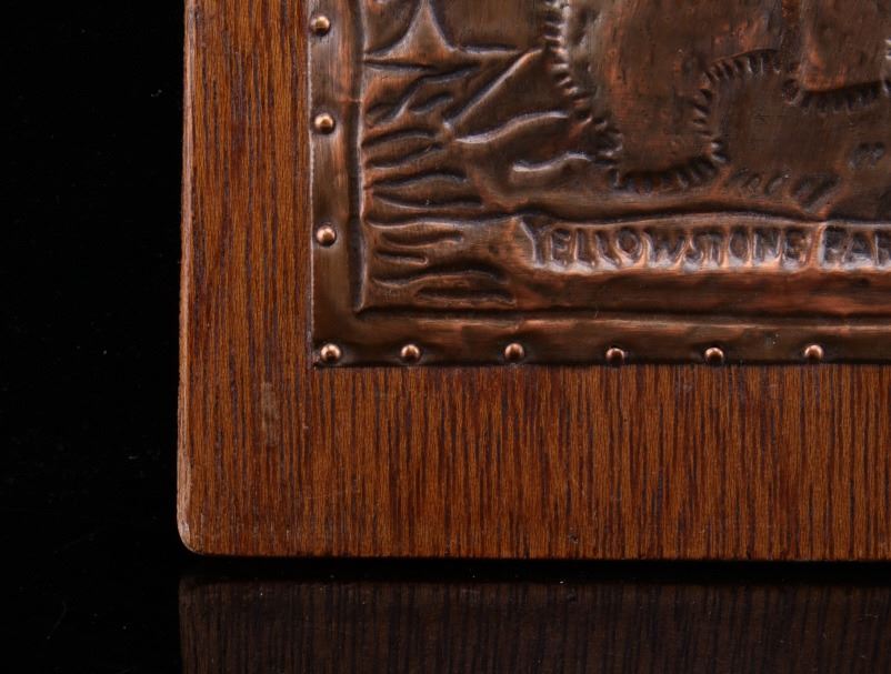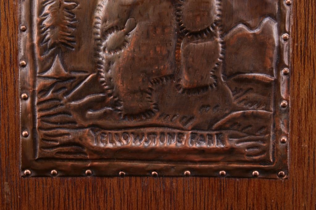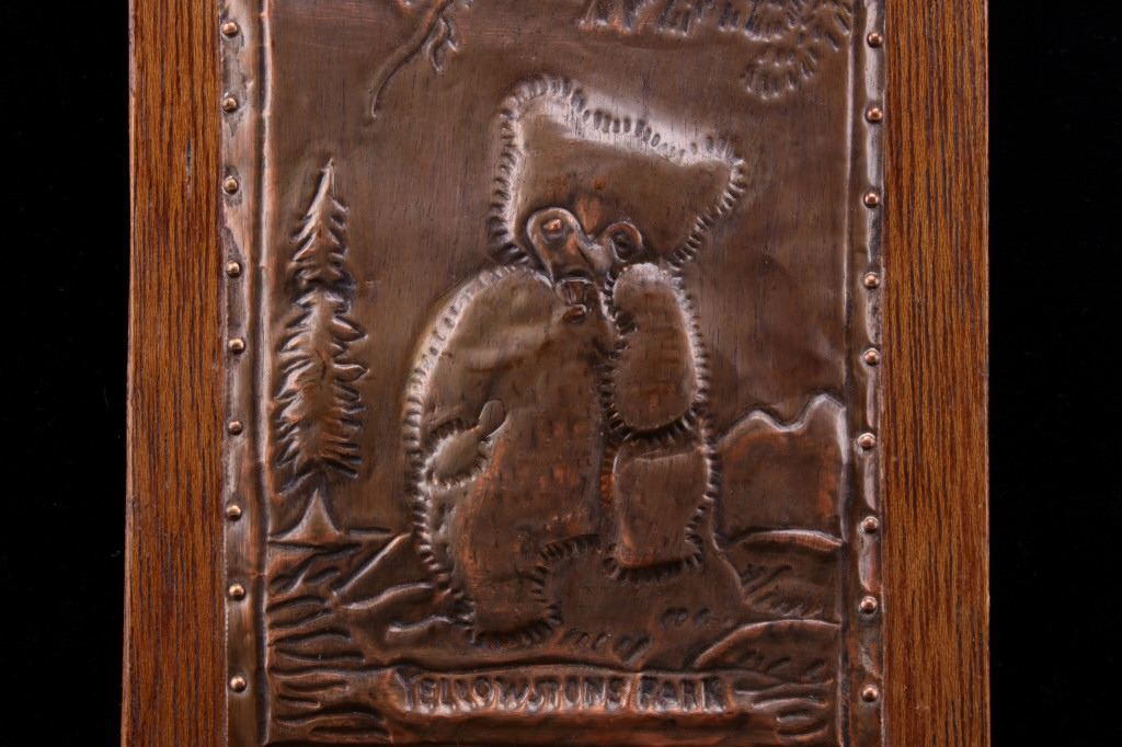 Included in this lot is a Yellowstone Park embossed wooden sign. This signed shows a brass-like embossed bear with a tree in the background. Under the bear is marked "Yellowstone Park". The sign is made from wood and is in good condition, showing some wear. The sign measures 7 1/2" by 5 1/2".