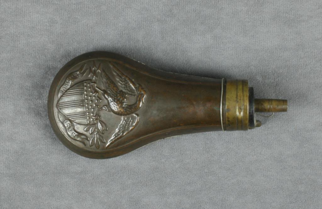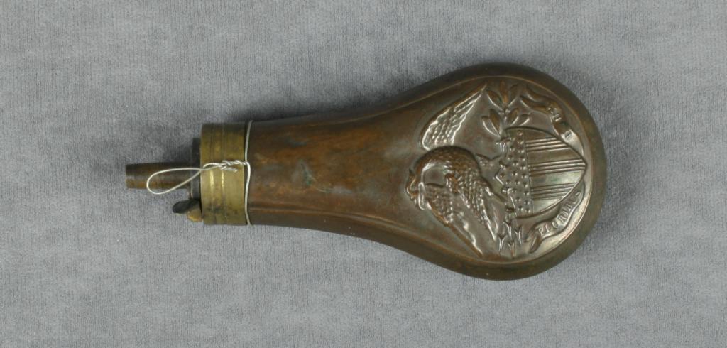 Embossed brass powder flask displaying a unusual spread eagle over union flag chevron on both sides, belt model percussion revolver sized, dark patina with some denting but overall very good. Est.: $125-$250.
