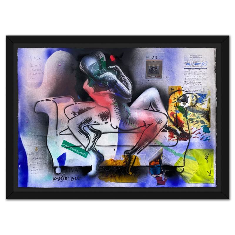 "Embrace of Reminiscence - New York" is an original mixed media painting on paper by Mark Kostabi, hand signed by the artist. The piece comes framed. Includes Certificate of Authenticity. Measures approx. 35.5" x 48" (frame), 29.5" x 42" (image). This item requires special handling and may have a longer than usual turnaround.