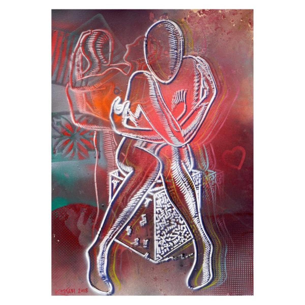 "Embracing Scarlet Passion" is a mixed media original painting on paper, by Mark Kostabi. The piece is hand signed and comes with a certificate of authenticity. Measures approximately 42" x 29.5".