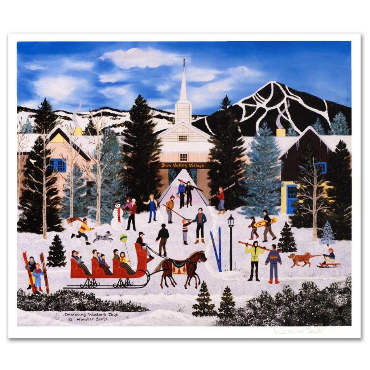 Cozy, down-home images of a bygone era when life was simpler - this is the feeling captured in the creations of one of the world's most recognized artists. "Embracing Winter's Joys" is a limited edition lithograph on paper, numbered and hand signed by Wooster Scott! Includes Certificate of Authenticity! Measures approx. 15" x 13" (with border), 14" x 11.5" (image). Reference #: 188211.