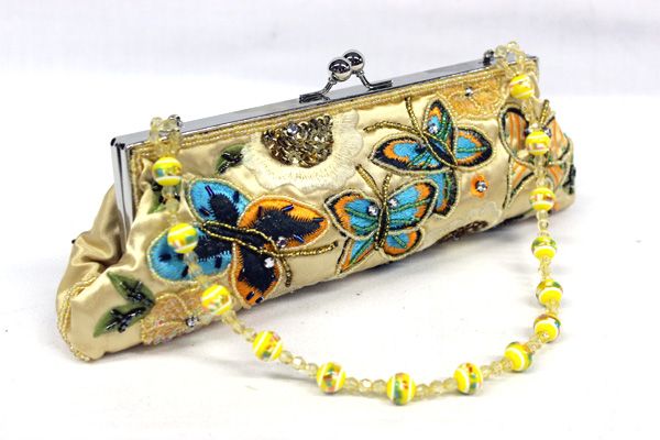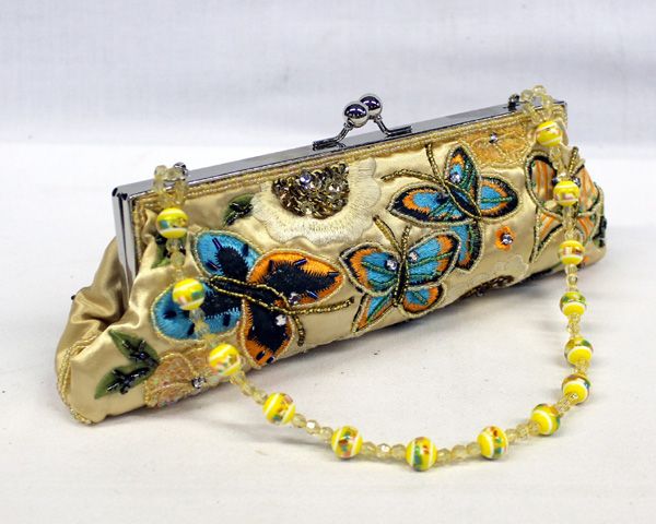 Embroidered Butterfly Evening Bag, sequined beaded flowers, gorgeous turquoise and orange embroidery on cream background, measures 4in. H x 10in. W, lovely beaded handle