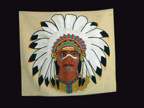 Embroidered Indian Pillow Top. Few moth holes otherwise very good condition. 20 X 18 inches. Was Made by NUDIES of North Hollywood, California.