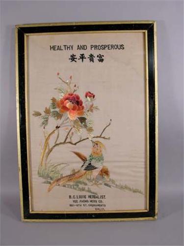 Embroidered linen sign for B.C. Louie, herbalist, Sacramento, CA. 16" x 24" Ex. cond.