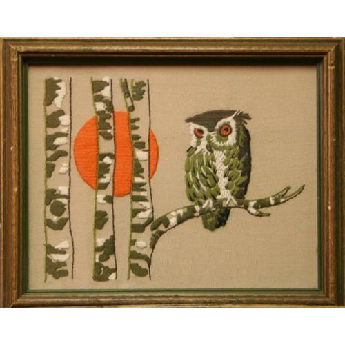 This piece is an original Erica Wilson design. It is a scene portraying an owl resting on a tree limb at sunset. This picture is stitched onto a beige canvas, in shades of green and orange. The frame is wood and resembles the rustic nature of the subject matter. It has an inner rim painted in a shade of olive green which nicely accents the colors of the picture. This would be a wonderful addition to the home of someone who appreciates unique depictions of nature.