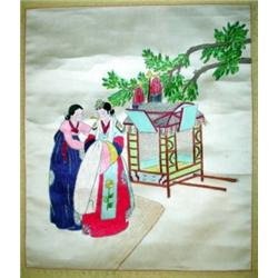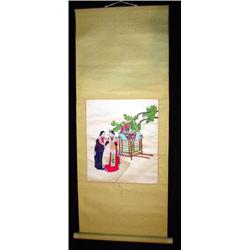 Scroll, Embroidered Koran bride on yellow silk. 7 holes in scroll with wrinkles - 49" x 16 1/4"