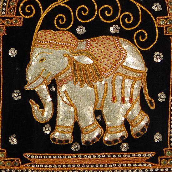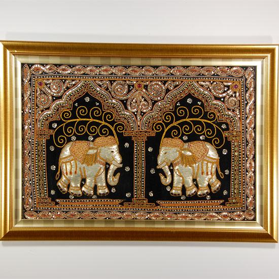 Handmade Burmese Wall Tapestry embroidered and sequined elephant pair. Many weeks of work go into each of these scarce pieces. Expensively framed, slight ding in frame, 35" x 25" overall. A truly beautiful investment.