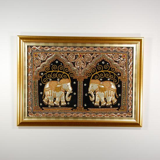 Handmade Burmese Wall Tapestry embroidered and sequined elephant pair. Many weeks of work go into each of these scarce pieces. Expensively framed, slight ding in frame, 35" x 25" overall. A truly beautiful investment.