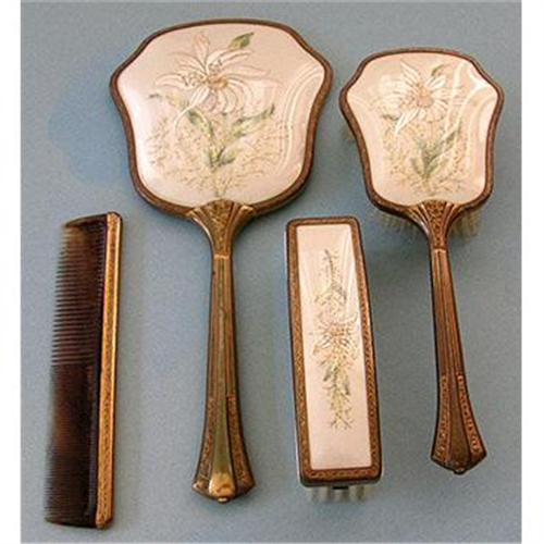 This outstanding brass or ormolu and embroidered silk dressing table set consists of a 12 x 8 vanity tray with ornate Art Deco metal feet and rim, a lace doily sandwiched between two panes of glass and centered with a silk embroidered flower medallion ? this motif runs through the rest of the pieces - 10 inch hair brush with Art Deco ormolu handle and stamped Nylon Made in ENGLAND? 13 inch beveled mirror with ornate Art Deco handle ? 6 inch clothes brush - and comb, edged with the same brass pattern. A celluloid cover protects the silk and embroidery on the mirror and brushes. The set dates to the 1940s and all the pieces, tarnished due to age, are in excellent condition.