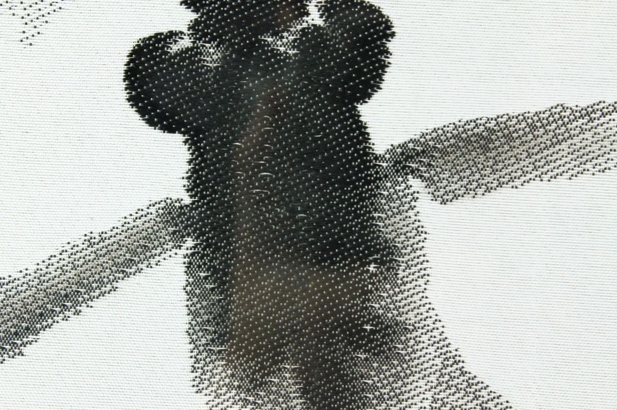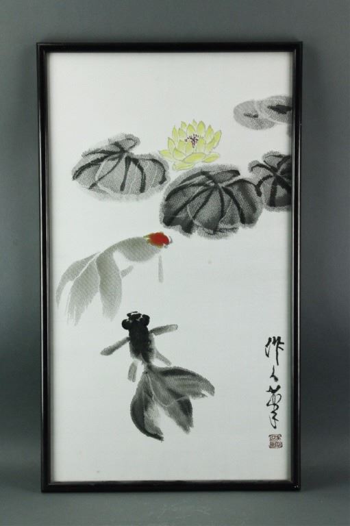 Chinese framed embroidery on silk; featuring pair of goldfishes in lotus pond; with artist name Zuoren and one artist seal; 73 cm x 43 cm