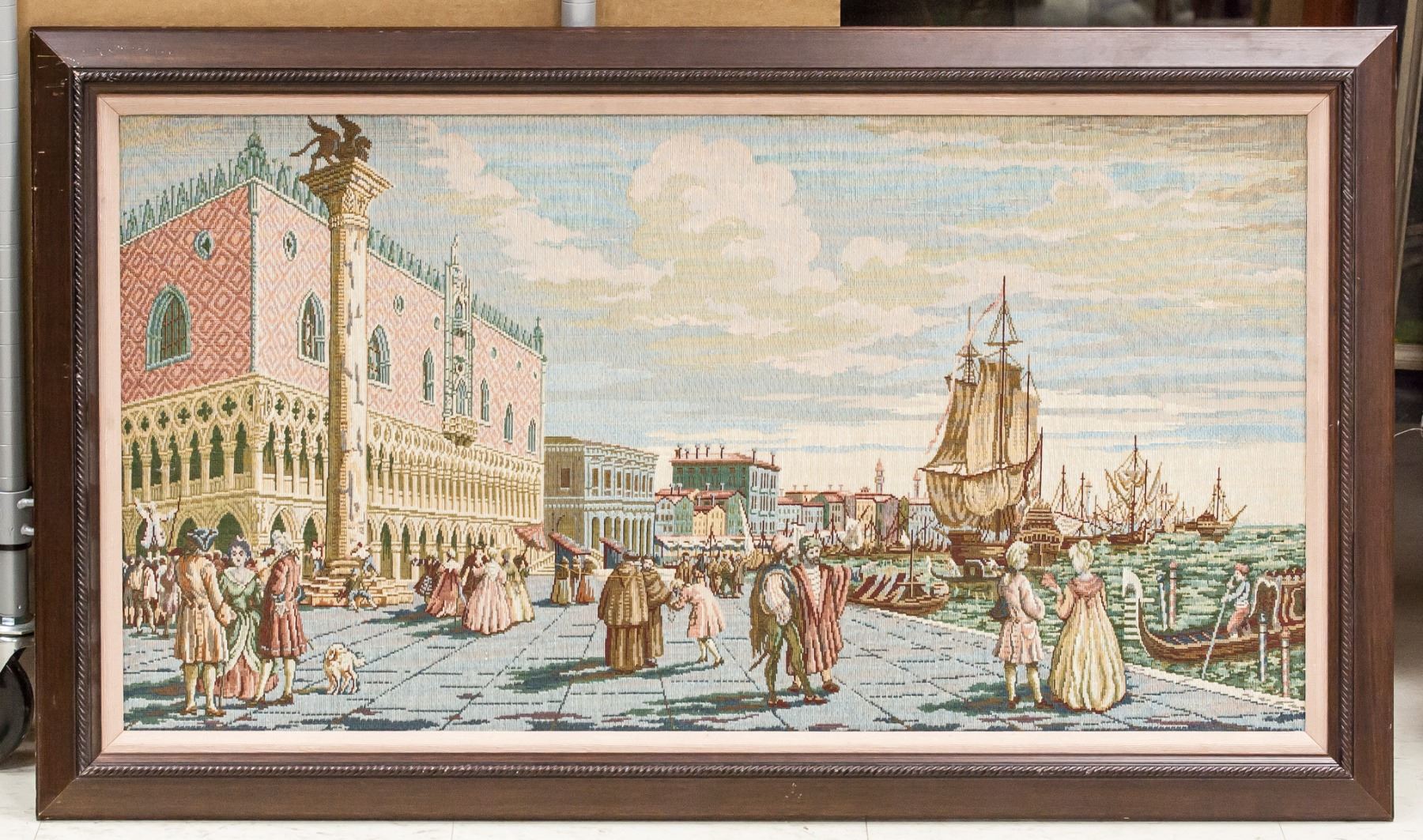 Embroidery, framed. Featuring 18th Century dockside scene. "111499" inscribed on verso with marker. Stamp on verso reads "LORI'S ART GALLERY Where Custom Framing is an Art IN WOODLAND HILLS VILLAGE 20929 Ventura Blvd. Woodland Hills, CA 91364 (818) 884-1110". Framed size: 59 x 101 cm (23 x 39.5 in)