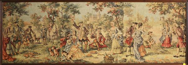 Framed machine made embroidery, Afternoon Picnic, European School, early 20th century, overall: 20''h x 56''w