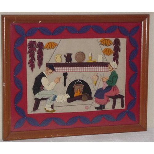 A hand embroidered picture, framed size 12" X 15", The scene is a man and woman sitting in front of a fire place as a cat warms itself near the fire. The woman is kniting as the man looks on. The picture is made of various pieces of felt and entirely hand stitched. A tranquil scene, framed in a simple wood frame and nonglare glass.(2)