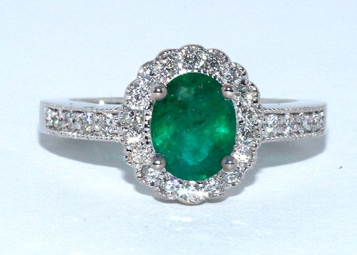 14k White Gold, Emerald 1.21ct Excellent Oval Cut and Deep Green color, .36ctw Round Diamond G-H color VS-SI clarity, Appraised Retail Value $12,000.00