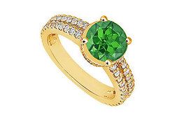 A large round emerald is prong-set in the center of two rows accentuated with smaller diamonds. Made in 14K yellow gold this engagement ring has a total weight (TGW) of 1.00 ct.