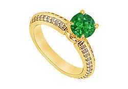 A lush-green round emerald is prong-set atop in the center & is accented by smaller round diamonds on the sides. This engagement ring is made in 14K yellow gold & has a total weight (TGW) of 1.00 ct.