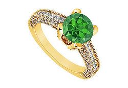 A brilliant-cut royal green emerald is set atop in the center. Smaller round diamonds are prong-set on three sides of the band. Made in 14K yellow gold this engagement ring has a total weight (TGW) of 1.25 ct.