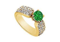 A brilliant-cut round emerald is center-set amidst a sparkling river of 30 smaller prong-set diamonds. This gorgeous wide engagement ring is made in 14K yellow gold & has a total weight (TGW) of 2.00 ct.