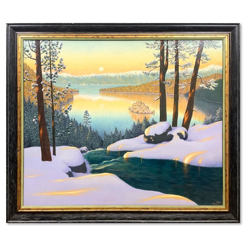 "Emerald Bay - Lake Tahoe" is an original oil painting on canvas by Bill Jewell, hand signed by the artist. This piece comes framed. Includes Letter of Authenticity. Measures approx. 34.5" x 40.5" (frame), 28.5" x 34.5" (image). There is some where on the frame.
