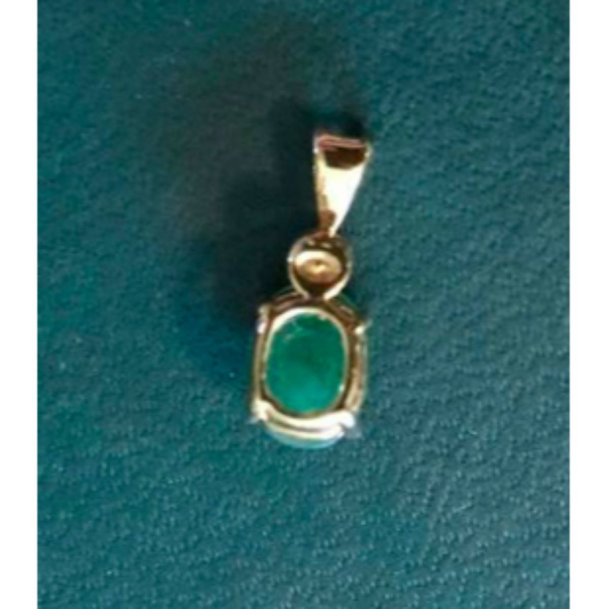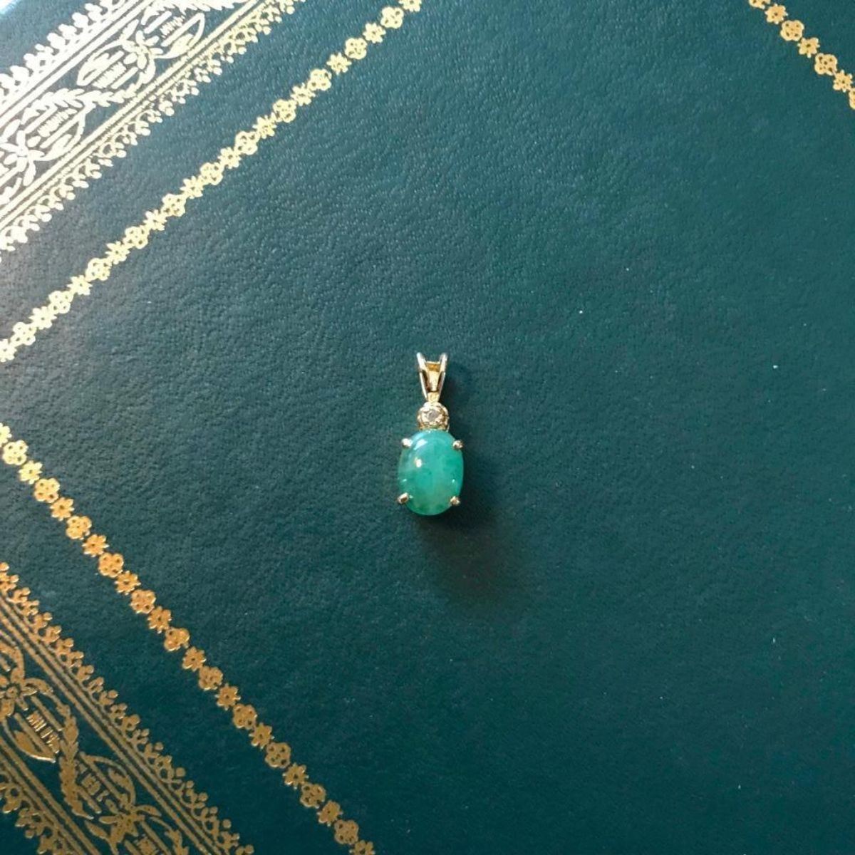5 X 7mm emerald cabochon set in gold plate over sterling silver with tiny pt diamond accent. Marked 925 on back.Â