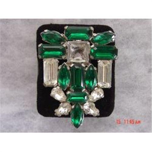 Here is a beautiful Art Deco Green Emerald and clear rhinestone glass dress clip or fur clip! It is in excellent condition. all stones remain sparkling, original, intact and hand placed and held intact by individual unique prongs.