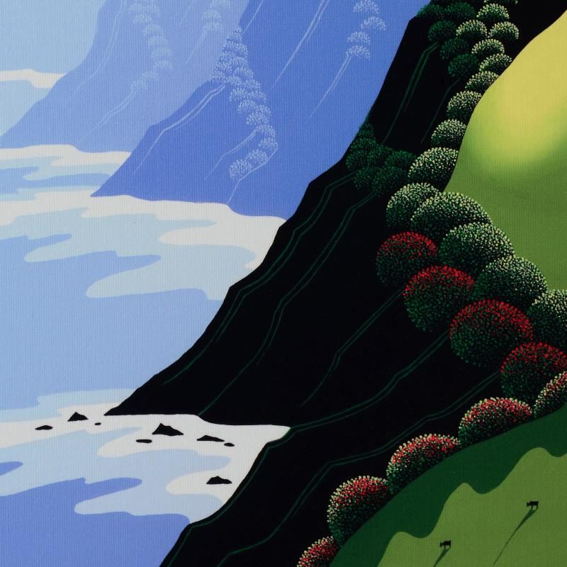 Larissa Holt, a student of distinguished artist Eyvind Earle(1916-2000), uses bold colors and breathtaking scenery to create images of Nature in her own unique style. "Emerald Cliffs" is a limited edition giclee on stretched canvas by Holt, numbered and bearing Holt's authorized signature. This piece comes gallery wrapped. Includes Certificate of Authenticity! Measures approx. 10" x 12.5" x 2" (image).