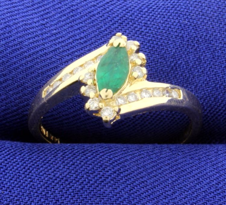 The center marquise cut emerald measures 8mm x 4mm, 20 brilliant cut diamonds for a total weight 1/2 carat. The emerald weighs approx .75 ct (3/4 ct) size 10. 3.6g
