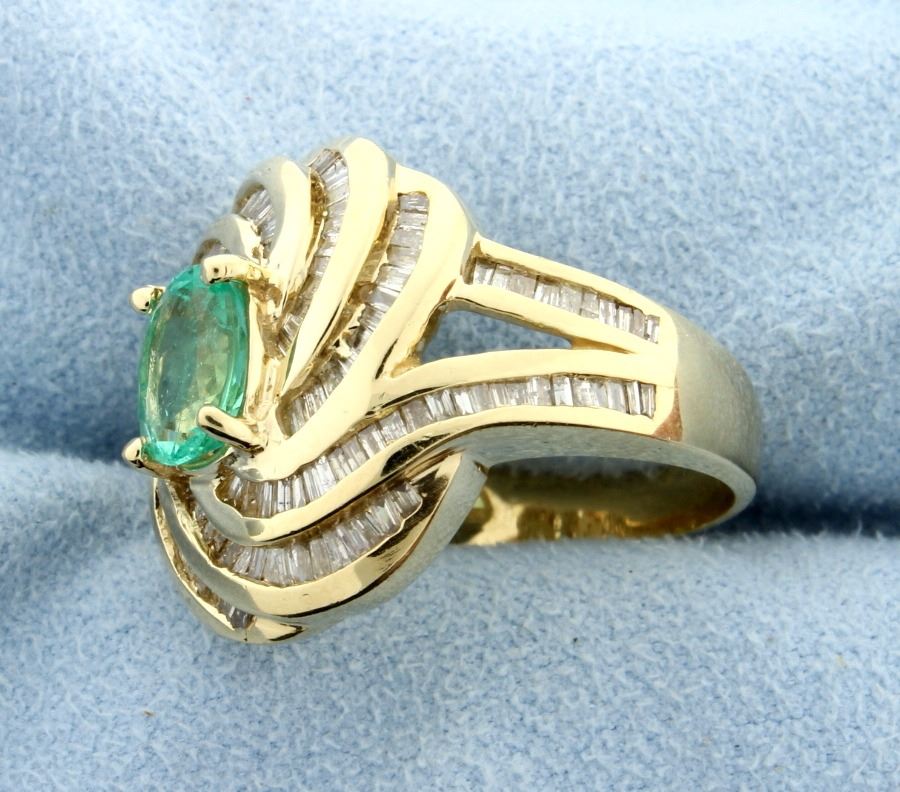 The center gem emerald measures 6.5mm x 7.82mm approx. weight 1.5 carats. There are baguette diamonds approx. 1.5 carats with SI-I1 clarity and I-J-K-L color. Ring size 7. Ring measures 3/4" x 3/4". 7.9g