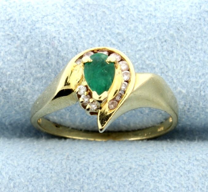 The center is a gem emerald 4mm x 5.5mm pear shape. There are 12 diamonds weighing approx. 0.15 ct TW. The clarity is SI2 and color H-I-J. Size 8. 3.0g
